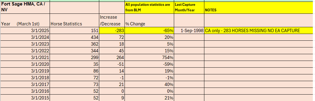 FORT SAGE Herd Management Area (HMA). BLM shows a 65% decrease in ONE year. During that one-year period, BLM reported no legal environmental assessment (EA) for any roundup of horses on this HMA and no legal roundup since September 1998. And yet the Fort Sage HMA is MISSING 283 of our wild horses this past year without any legally required notice (EA) to the public. These are our horses by congressional law and were SUPPOSED to be under the BLM’s protection.