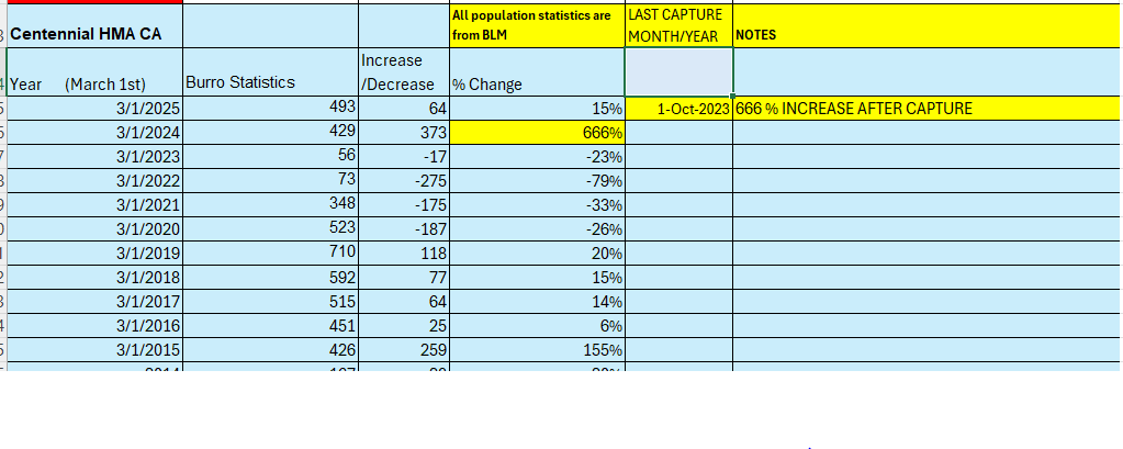 CENTENNIAL Herd Management Area (HMA) BLM shows a 666% increase in ONE year. This would require the herd of 56 burros to produce 373 successful foals in one year, meaning every single burro – including the jacks – have more than six surviving foals in one year. Biologically impossible