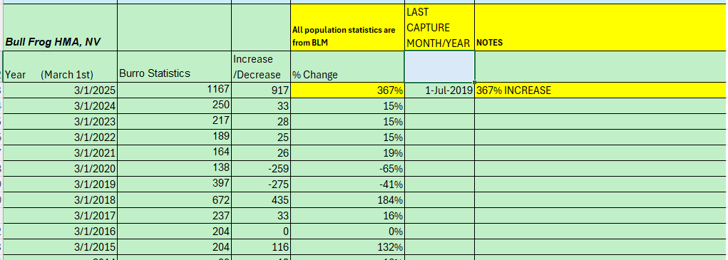 BULLFROG Herd Management Area (HMA) BLM shows a 367% increase in ONE year. This would require the herd of 250 burros to produce 917 successful foals in one year, meaning every single burro – including the jacks – have more than three surviving foals in one year. Biologically impossible
