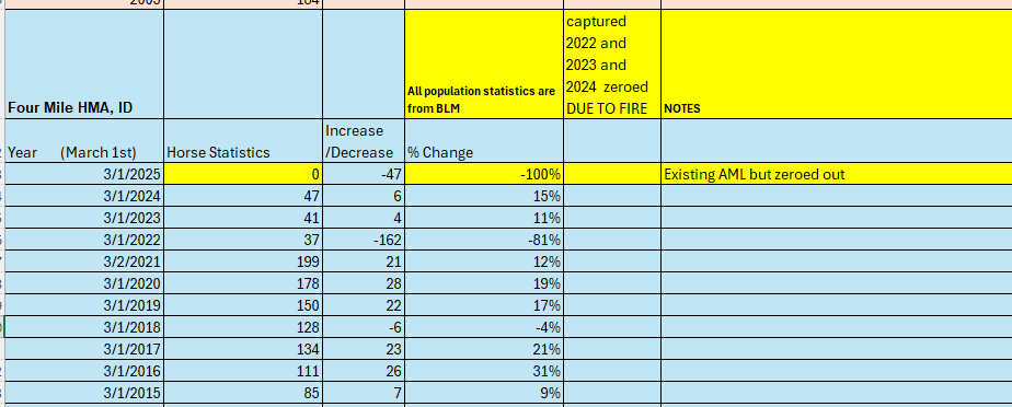 FOUR MILE Herd Management Area (HMA) BLM shows capturing 162 wild horses in 2021/22 followed by zeroing out the entire herd in 2024 due to fire although the Appropriate Management Area (AML) is still 37-60 and none have been returned to their legal land.