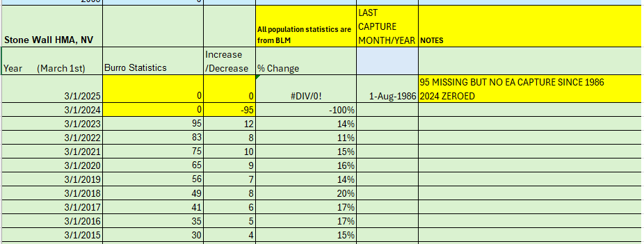 STONEWALL Herd Management Area (HMA), NV. BLM shows 95 wild burros in March 2023 but then a year later March 2024 ALL burros were missing but the public was not notified and no legally required environmental assessment (EA) for capture was done by BLM resulting in zero burros on their legally land.