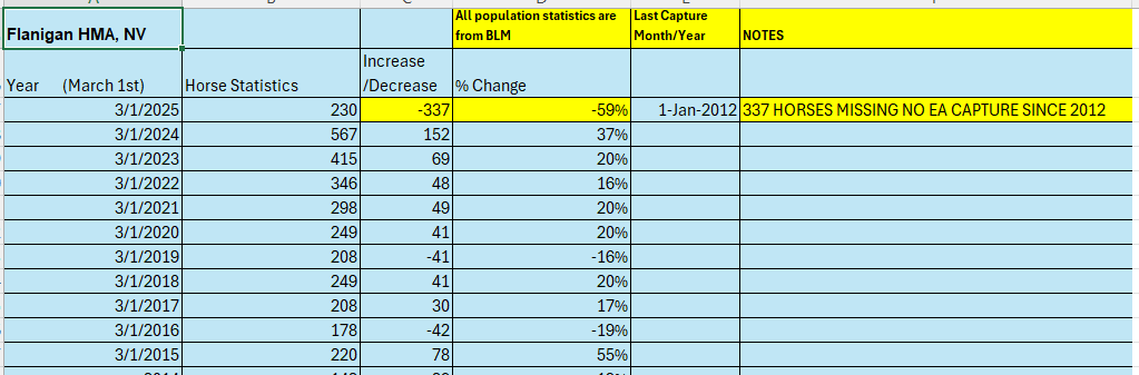 FLANIGAN Herd Management Area (HMA). BLM shows a 59% decrease in ONE year. During that one-year period, BLM reported no legal environmental assessment (EA) for any roundup of horses on this HMA and no legal roundup since annuary 2012. And yet the Flannigan HMA is MISSING 337 of our wild horses this past year without any legally required notice (EA) to the public. These are our horses by congressional law and were SUPPOSED to be under the BLM’s protection.