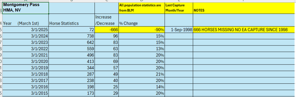 MONTGOMERY PASS Herd Management Area (HMA). BLM shows a 90% decrease in ONE year. Although a massive capture was planned for May of 2025, during that one-year period of March 2024 to March 2025, BLM reported no legal environmental assessment (EA) for any roundup of horses on this HMA and no legal roundup since September 1998. And yet the Montgomery Pass HMA is MISSING 666 of our wild horses this past year without any legally required notice (EA) to the public. These are our horses by congressional law and were SUPPOSED to be under the BLM’s protection.