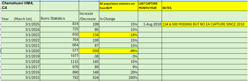 CHEMEHUEVI Herd Management Area (HMA). BLM shows a 46% decrease in ONE year. During that one-year period, BLM reported no legal environmental assessment (EA) for any roundup of burros on this HMA and no legal roundup since August 2018. And yet the Chemehuevi HMA was MISSING 634 of our wild burros in 2020 without any legally required notice (EA) to the public. These are our burros by congressional law and were SUPPOSED to be under the BLM’s protection.