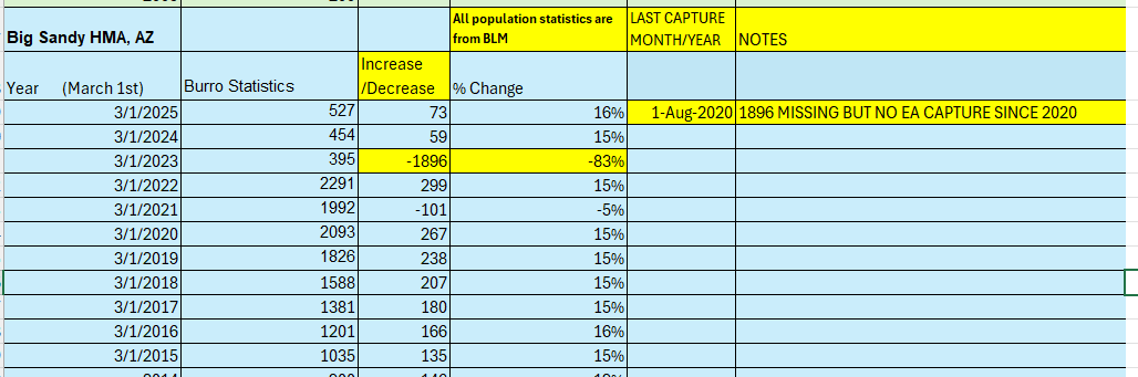 BIG SANDY Herd Management Area (HMA). BLM shows an 83% decrease in ONE year. During that one-year period, BLM reported no legal environmental assessment (EA) for any roundup of burros on this HMA and no legal roundup since August 2020. And yet the Big Sandy HMA was MISSING 1896 of our wild burros in 2023 without any legally required notice (EA) to the public. These are our burros by congressional law and were SUPPOSED to be under the BLM’s protection.